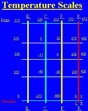 Kelvin Scale: Where +233 degs. is freezing, 313.15 degs. is boiling. -273.15 Degs. is Absolute.