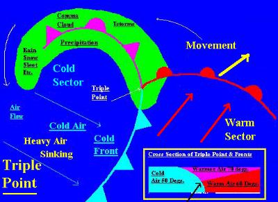Triple Point: Point of occlusion where the occluded, cold and warm fronts come together.